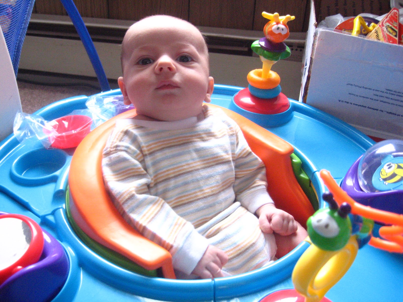 The Doctor was extremely impressed with how well he can hold his head up. He is finally able to sit in the mini saucer I bought him, although his arms aren't long enough to reach any of the toys. I don't think he would even know what to do with them is he could.